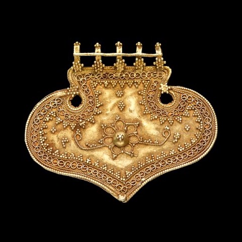 Indian 18ct gold heart shaped pendant richly decorated with granulation. A high cast dowry ornament 11.5gm, circa 1900. $4,000 ANNE SCHOFIELD ANTIQUES