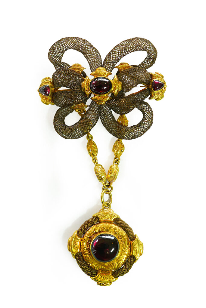 It is designed as a large bow applied to an engraved gold base set with garnets. A chain hung with a detachable gold pendant section terminates in a gold locket set with a central garnet decorated on four sides with plaited human hair. Inside the crystal locket on the back is more woven hair surrounded by decorative gold carving.