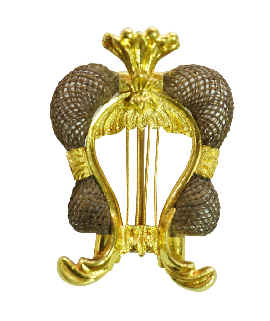 Lady Susannah Hindmarsh returned to England and died on the 2nd April 1859. It was then that the mourning brooch was made using her hair. The collection included another exquisite lyre-shaped gold brooch made with human hair, again in its original case by Antoni Forrer.