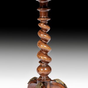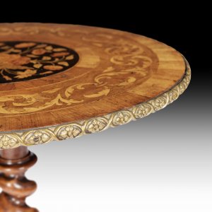 Marquetry Occasional Tables: A matched pair of 19th century English marquetry occasional tables in good original condition, the central marquetry tops ebonised and inlaid with foliate marquetry bordered by radiating cross-banded kingwood and satinwood inlay supported on a twisted solid walnut column terminating in three cabriole legs with gilded bronze mounts. The tables have ever so slightly different colours in the tops of each marquetry surface. Price includes cleaning and re-polishing.