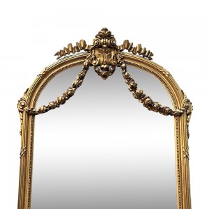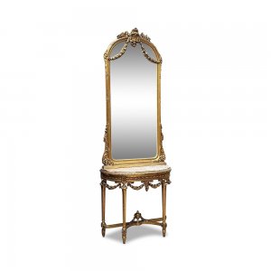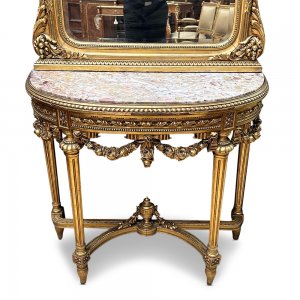 Behold, this magnificent piece!A superb and highly decorative 19th-century French gilt console table and mirror, dating to circa 1870, exemplifying the elegance and refinement of French artistry.The ensemble is centred around a striking half-round rouge marble top, its muted tones beautifully offset by the finely carved and giltwood base. The table is supported by four fluted legs, each crisply detailed and united by a shaped stretcher centred with a classical urn.Above, the tall matching mirror rises in a graceful arched form, lavishly adorned with floral swags, all finely carved and retaining a luminous gilt finish. This same embellishment continues just below the table top with swags of roses giving the table a highly opulent feel.The harmony between marble, giltwood, and sculptural ornament creates a piece of considerable presence, equally suited to a grand entrance hall, bedroom, or formal interior. Both functional and ornamental, this console and mirror set offers a timeless expression of French sophistication and craftsmanship.A beautifully preserved example, capturing the enduring appeal of classical French design at its most elegant.