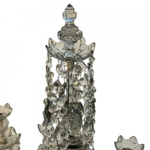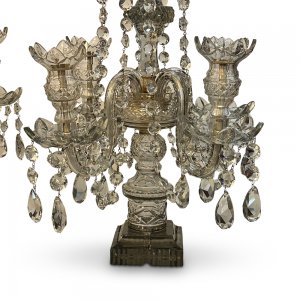 A superb and rare pair of early 19th-century English glass girandoles, beautifully crafted circa 1820. These elegant centrepieces exemplify the refined taste and technical skill of the Regency period, with finely cut and moulded glass throughout.Each girandole features a tall central stem rising from a square plinth base, supporting four scrolling branches fitted with flower-shaped nozzles. The forms are richly embellished with cascading faceted prisms and delicate drops, designed to catch and refract candlelight with exceptional brilliance. The symmetry and proportion of the pair create a striking visual presence, whether displayed on a mantel, sideboard, or dining table.Remarkably well preserved, retaining their original glass drops, these girandoles offer both sculptural beauty and historical significance. Decorative yet functional, they represent a highly desirable example of English Regency glass, equally suited to classical interiors or as a dramatic contrast in more contemporary settings.Available to view in our Showroom at 16-22 View St. Bendigo.