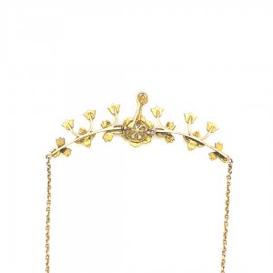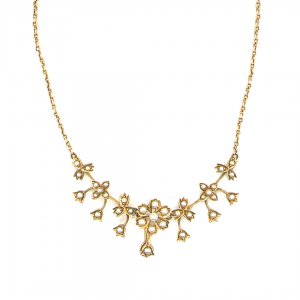 Introducing this lovely antique necklace from the 19th century.This beautiful piece has been crafted from 15ct yellow gold in England circa 1870. It features 36 pearls inset into a central daisy pattern and more flower shapes to the sides of the daisy.Its timeless design is fit to be worn in the modern day due to its quality and beauty. The necklace sits comfirtably at the perfect length around the neck and would be suitable on top of a high necked top or directly against the skin.Come down to the store and try this wonderful antique necklace on to truly appreciate its beauty!