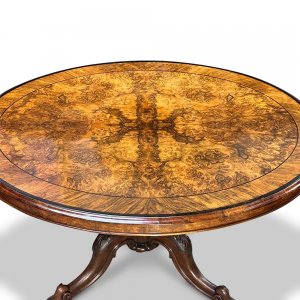This beautiful burr walnut centre table was crafted in England circa 1870.It features a ornately carved central pedestal base with 4 feet. The table top has been crossbanded which gives the table a wonderful character.4 people could comfortably sit around this table to dine. It would otherwise be fantastic in an entryway or lobby.