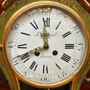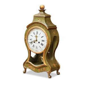 Introducing a stunning little French mantle clock, crafted in the 19th century.By Parisian clockmaker Lieutaud, this pretty piece features a green metal outer casing which has been hand painted with floral embellishments. It’s graceful curved shape finishes at the top with a round gilt crowning finial. The clock face is both clear and beautiful and can be seen from across the room. It displays both roman numerals for the hours, and Arabic numbers for the minutes.What makes this clock special is the clear windows to either side and the lower front, whereby you can see in to the clock’s workings.