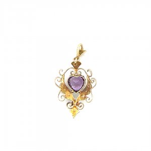 This darling rose gold pendant was crafted in the late 19th century.It features a large central heart shaped amethyst and is surrounded by seed pearls and a scrolled gold setting.A beautiful antique piece for that special someone.