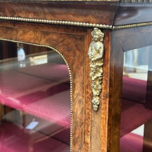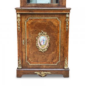 An exceptionally rare and highly decorative pair of late 19th-century English display cabinets, crafted circa 1880.Beautifully constructed in richly figured burr walnut, each cabinet displays a wonderfully warm and complex grain, enhanced by meticulous polishing and expert cabinetmaking. The lower doors are centred with exquisite hand-painted porcelain plaques in the manner of Sèvres porcelain, depicting romantic pastoral scenes framed within ornate gilt bronze mounts—adding a touch of unmistakable French influence to these distinctly English pieces.The upper sections feature glazed doors opening to reveal shelved interiors, lined in a striking deep crimson fabric, perfectly designed for the display of fine objects. The glazing is framed by elegant mouldings and further enriched with finely cast gilt bronze mounts, including foliate appliqués and escutcheons of the highest quality.Each cabinet is raised on a plinth base adorned with additional ormolu ornamentation. The Amboyna crossbanding showcases the incredible artistry and craftsmanship of this special pair. The proportions are both practical and visually impressive, making them ideal as statement pieces in either a traditional or contemporary interior.Pairs of this quality and condition are seldom encountered on the market, particularly with original porcelain panels intact. Their combination of English craftsmanship and continental decorative influence makes them especially desirable to collectors and interior designers alike.