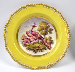 A fine and rare pair of Flight Barr and Barr Worcester side or berry plates, having a highly desirable yellow ground, hand-painted to the centre with exotic birds with gilded gadrooned rims, impressed 'FBB' surmounted by a crown to verso.