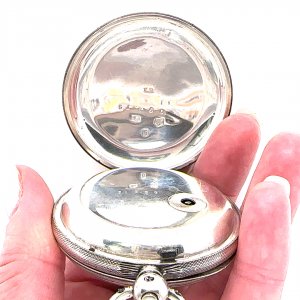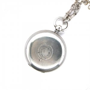 A handsome and authentic example of Victorian horology, this English sterling silver open-faced pocket watch, dated circa 1871, is a timeless piece of both function and style.The watch features a classic silver enamel dial with Roman numerals, complemented by elegant blued steel hands and a subsidiary seconds dial—hallmarks of quality 19th-century watchmaking. The finely engraved centre adds a subtle decorative flourish, while maintaining a clean and highly legible design.Encased in solid sterling silver, the outer case displays a finely engine-turned finish to the reverse, centred with a vacant cartouche—traditionally intended for personal engraving. The case retains a pleasing weight and patina, reflecting its age and careful preservation over more than 150 years.Accompanying the watch is a substantial sterling silver fob chain, complete with T-bar and swivel clasps, perfectly suited for wear with a waistcoat and adding both practicality and period charm.Pieces such as this evoke the refinement of Victorian gentleman’s attire, where the pocket watch was both an essential timekeeping instrument and a statement of taste.
