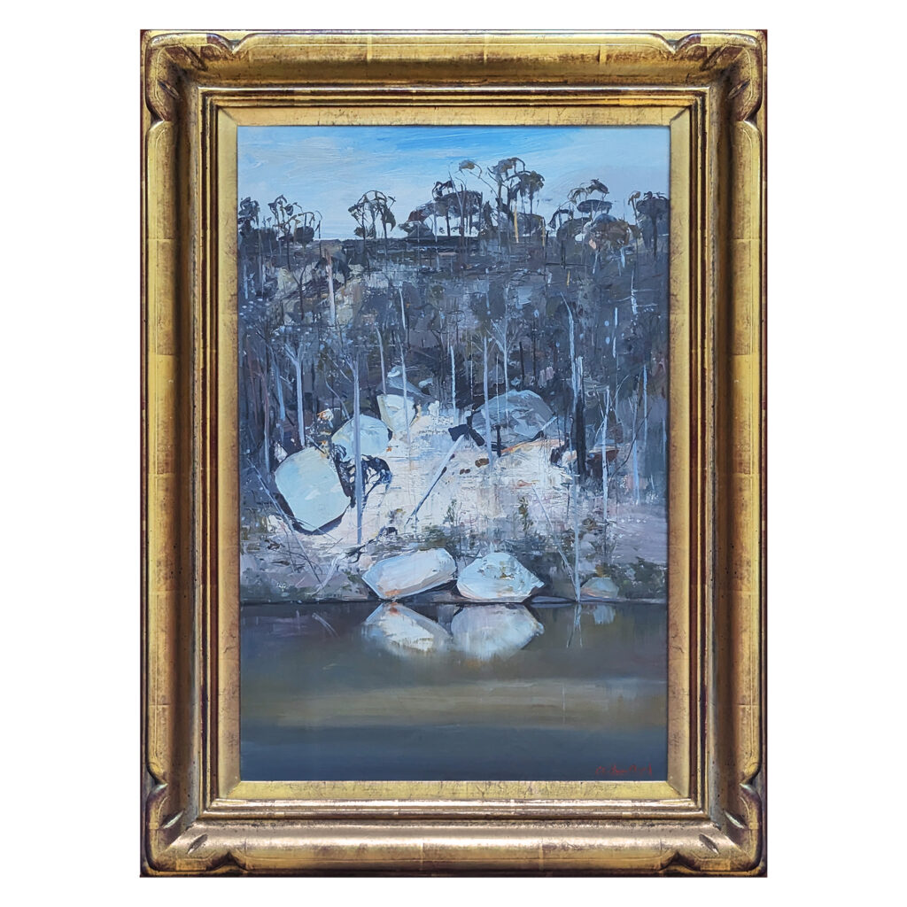 Boyd is a famous Australian artist. He was recognised on the International stage from the mid to late 20th century, with work ranging from impressionist renderings of Australian landscape to starkly expressionist figuration. He is one of the highest valued Australian artists, and is represented in all major National Galleries in Australia and in the UK. His renowned ‘Bride’ series paintings regularly fetch over $1million per work. Boyd was a member of the Antipodeans, a group of Melbourne painters that also included Clifton Pugh, John Brack, Robert Dickerson, John Perceval and Charles Blackman. He is also part of the Boyd family artistic dynasty that includes painters, sculptors, architects and other arts professionals. This incredible piece is one of the finest examples of his ‘Shoalhaven’ series, a series which lasted from the early 1980s until his death, painted on his property in Bundanon as payment for a legal bill, and comes with esteemed provenance.