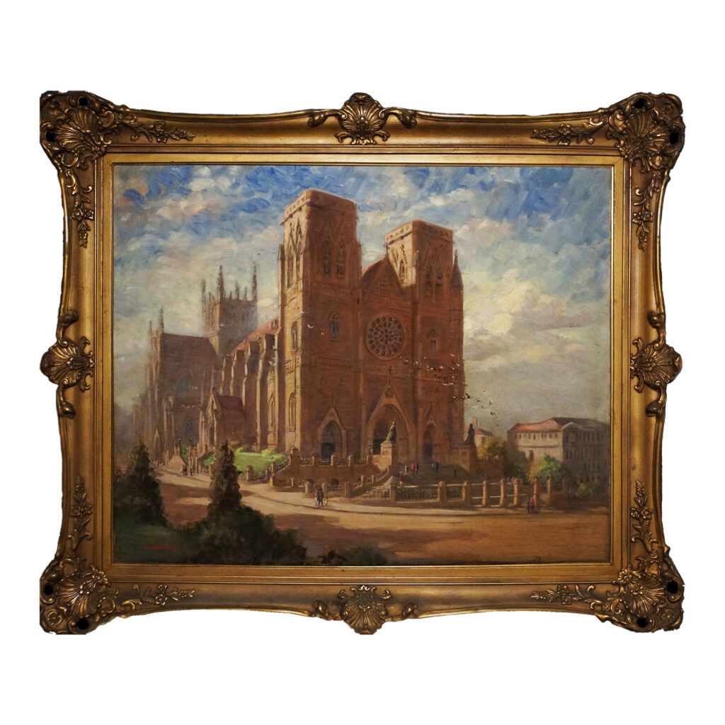 Edgecombe was a prolific Australian artist and six-time Wynne Prize finalist. Edgecombe was a member of the Royal Art Society and commitee member of the Australian Watercolour Society. He was known for his impressive landscapes and cityscapes of Sydney and the East Coast of Australia. His works are represented in several major institutions such as the New England Regional Art Museum. St. Mary’s Cathedral is one of Australia’s greatest colonial architectural achievements, designed in the Gothic Revival style by the iconic English architect, Augustus Pugin, in 1868 and modifications continue to present day. Edgecombe was a member of the Royal Art Society and commitee member of the Australian Watercolour Society, this impressive oil of was originally donated to the Catholic Church by Edgecombe himself.