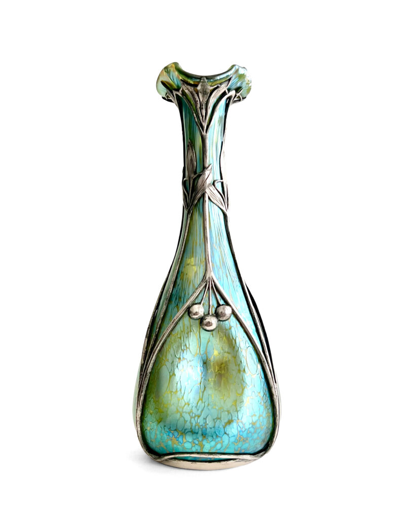 A fine & rare Art Nouveau iridescent glass vase of dimpled bottle form with frilled rim. Decor from Loetz’s ‘Crete Papillon’ series of green glass with iridescent oil spotting. The silvered metal mounts, in the form of delicate fruit & foliage, created by Austrian metal worker / silversmith Moritz Hacker. Unsigned. Polished pontil mark.
