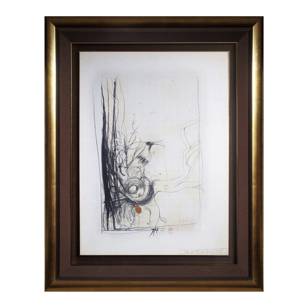 This impressive, original mixed media study is extremely RARE!! It was part of a series of Bird studies based on the work of French poet, Charles Baudelaire, including “Baudelaire’s Bird” (1973) & Butcher Bird With Baudelaire’s Eyes” (1972). They were completed around the time he constructed his epic, self-portrait “Alchemy” (1972-73).