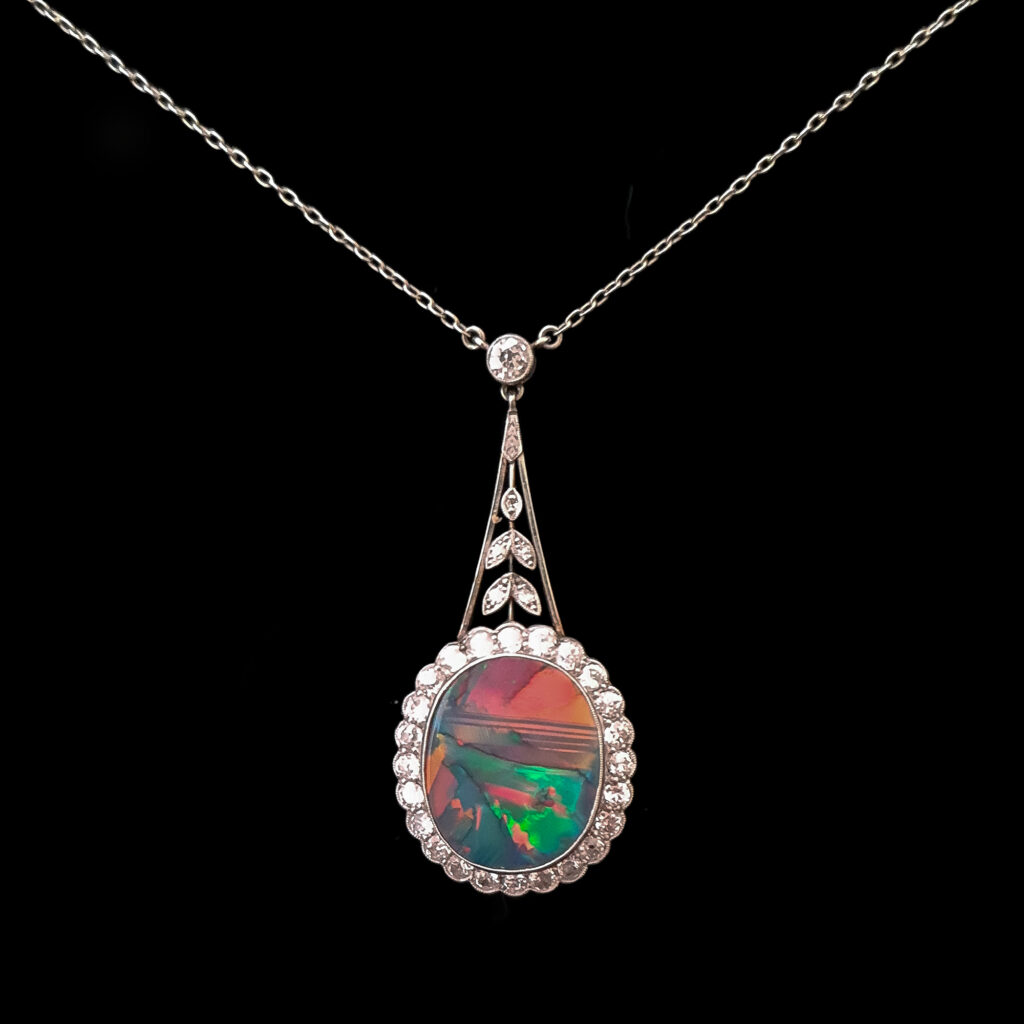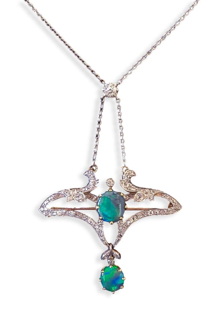Platinum and gold set diamond and black opal pendant/ brooch. French c1910. $15,500