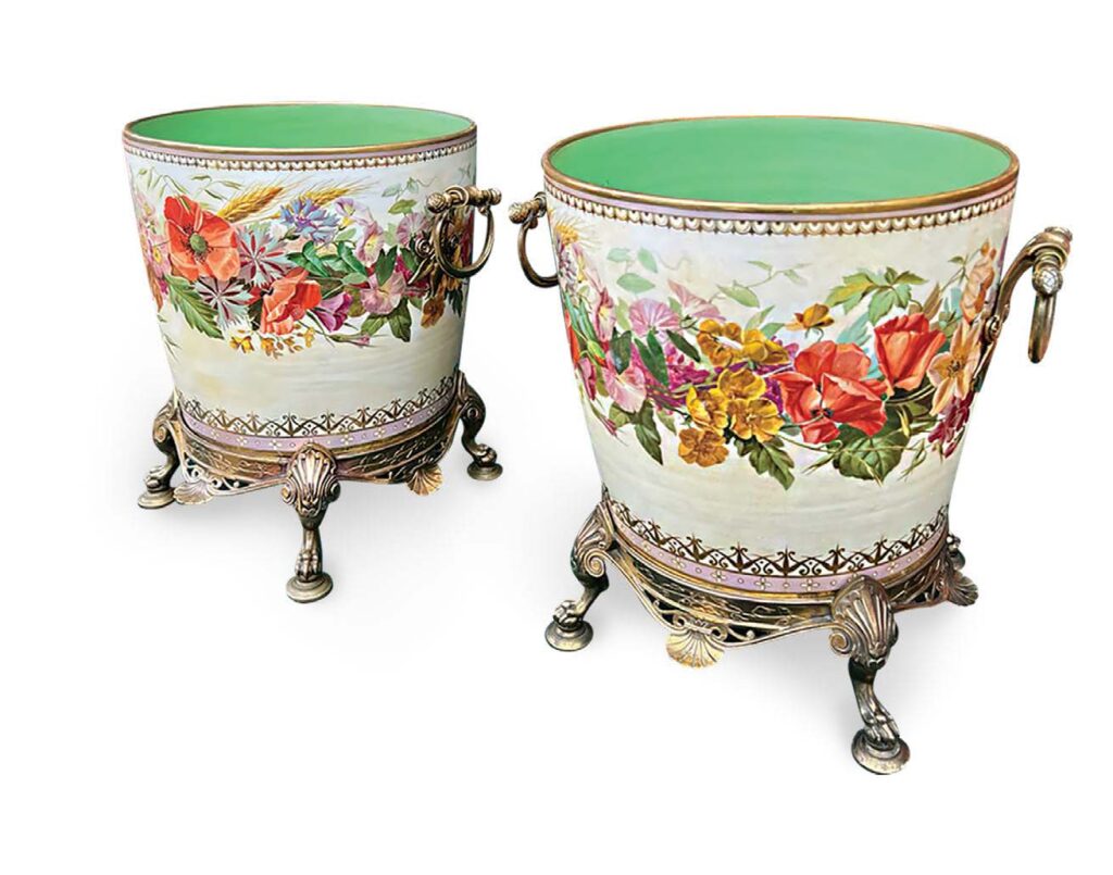 Decorative porcelain planters meant to hold a potted plant.These have hand painted floral decoration, green glazed interiors, and gilt bronze/ormolu mounts with ring handles and footed bases. Circa 1890.