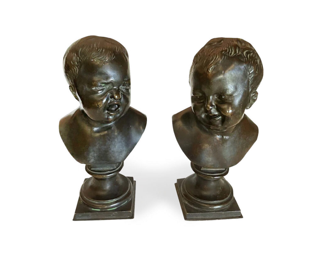 French Napoleon III pair of bronze statues, “Jean who laughs and Jean who cries” after Jean-Antoine Houdon. C1850 Originally interpreted from an 18thC poem by Voltaire embodying the versatile nature of humanity from happiness to sorrow.