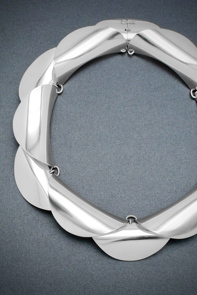 A rare original solid silver necklace of two staggered layers of six edge to edge curved petals joined with oval links and finished with an integrated box clasp closure and additional figure of eight safety clasp – marked 925 for Sterling silver and with post 1945 marks for Georg Jensen of Copenhagen along with design number 129 and Monogram for Nanna and Jogen Ditzel and known as the Lotus Necklace designed 1961 – c.1965 Denmark Notes: this is the original version; a limited archive release was made in 2020