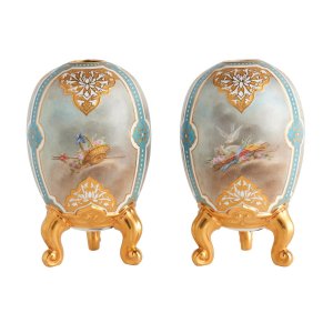 Each of egg shape raised on three gilt scrolling feet, each body divided with turquoise and gilt borders into three upright panels, the front panel decorated in eighteenth century French manner with a flying putto, the others with vignettes of various objects and flowers, one of the principal panels signed PL or LP (the letters conjoined), printed factory marks underside